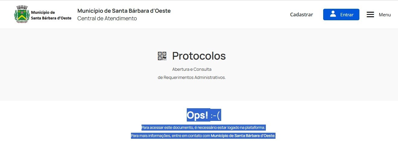 Segundo o parlamentar, cidadãos têm procurado seu gabinete relatando que não conseguem consultar o andamento de processos nos links “Protocolo – Consulta” e “Inova SBO 1Doc”, disponíveis na aba “Serviços Online”. O sistema, que anteriormente permitia acesso mediante número de protocolo, ano e CPF, agora exige login e frequentemente apresenta a mensagem: “Ops! :-( Para acessar este documento, é necessário estar logado na plataforma).”