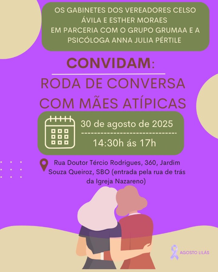 Em mais uma ação de apoio às mulheres e à causa do autismo, os gabinetes dos vereadores Celso Ávila e Esther Moraes, em parceria com o grupo Grumaa e a psicóloga Anna Julia Pértile, promovem no próximo sábado, 30 de agosto, a roda de conversa “Mães Atípicas”, das 14h30 às 17h, na Rua Doutor Tércio Rodrigues, 360, Jardim Souza Queiroz. A entrada será pela rua de trás da Igreja do Nazareno.