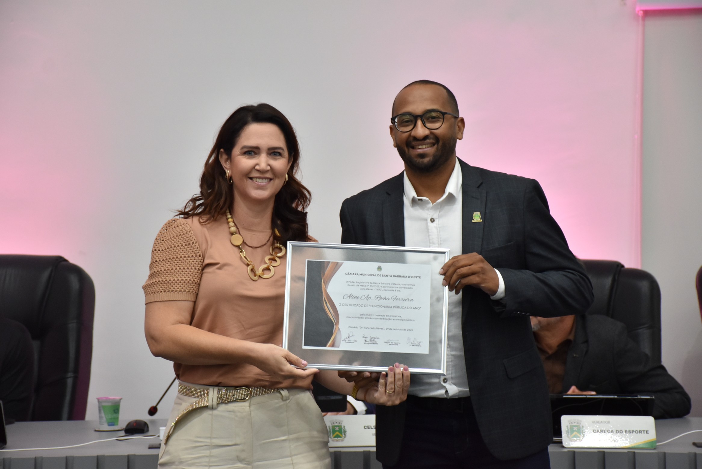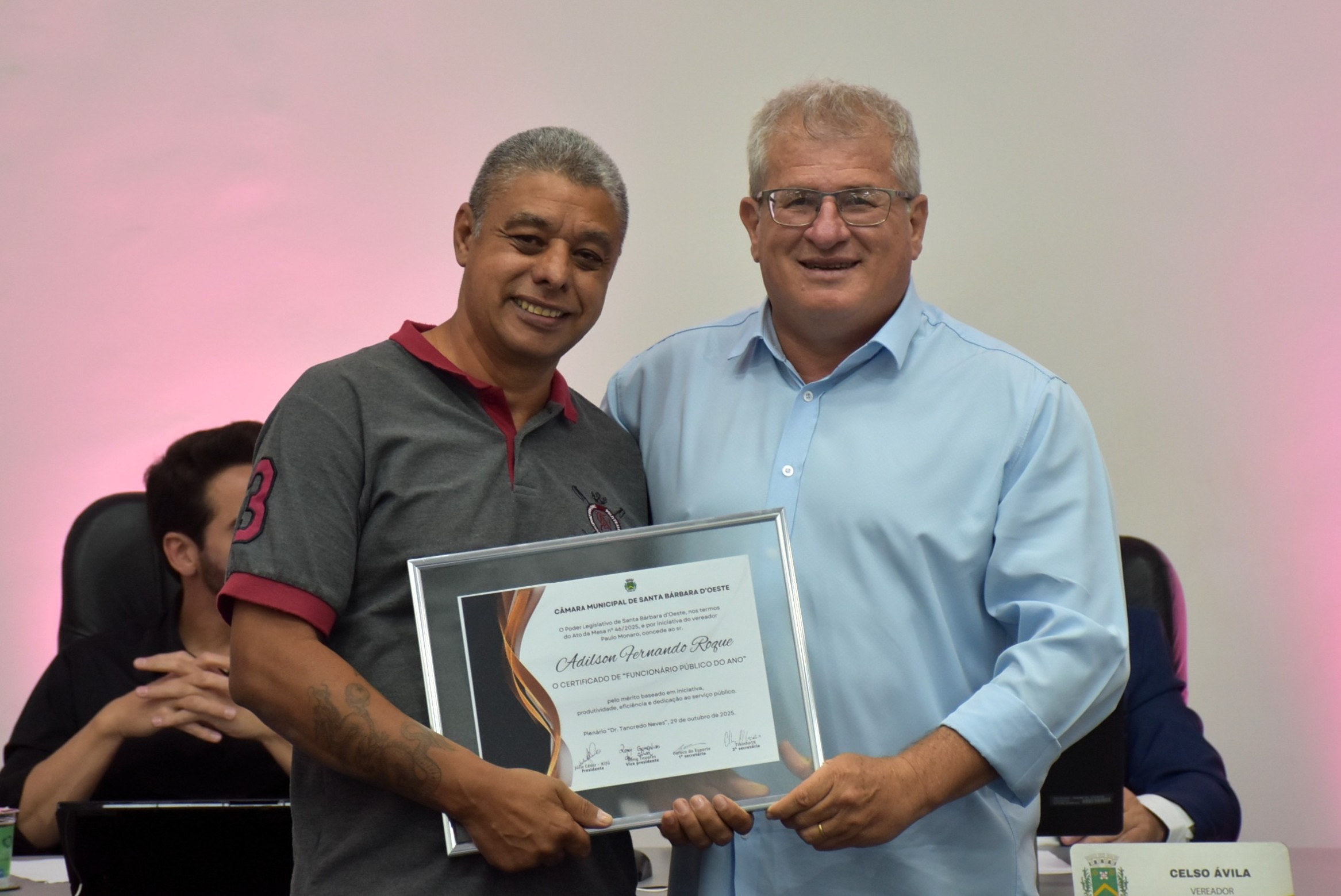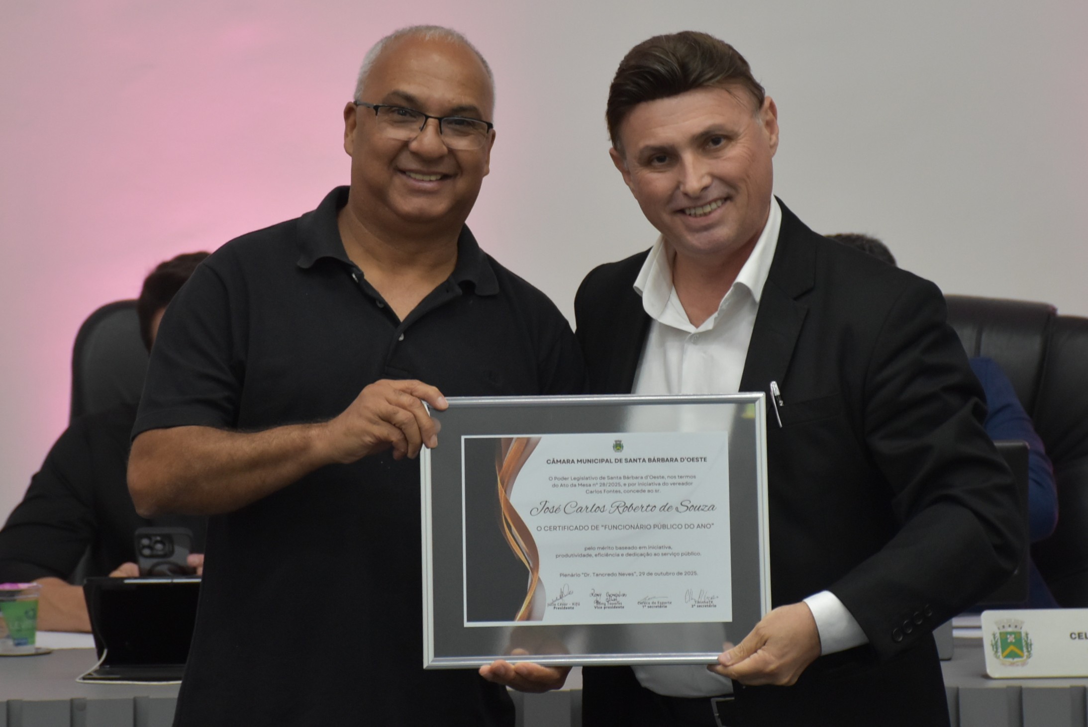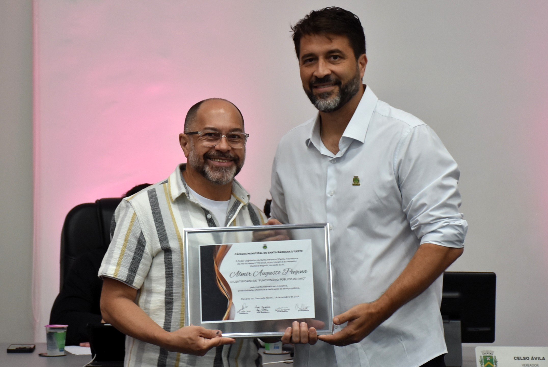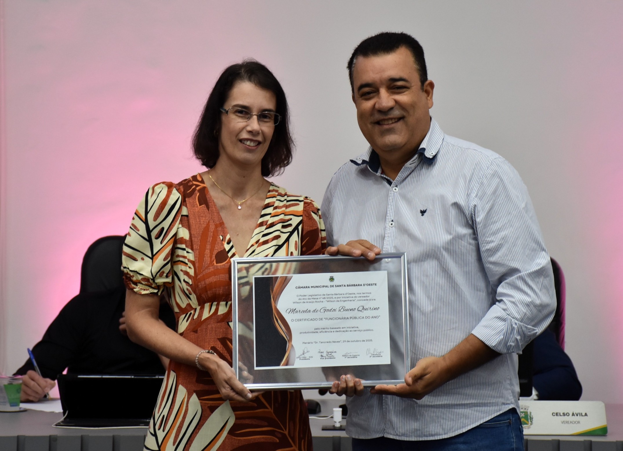 A Câmara Municipal de Santa Bárbara d’Oeste realizou, na noite desta quarta-feira (29), a solenidade de entrega do certificado de “Funcionário Público do Ano”, no Plenário “Dr. Tancredo Neves”. A homenagem, instituída pelo Decreto Legislativo nº 02/2014, de autoria do vereador Celso Ávila, reconhece servidores municipais que se destacaram pelo mérito, dedicação, eficiência e compromisso com o serviço público e com a comunidade barbarense.