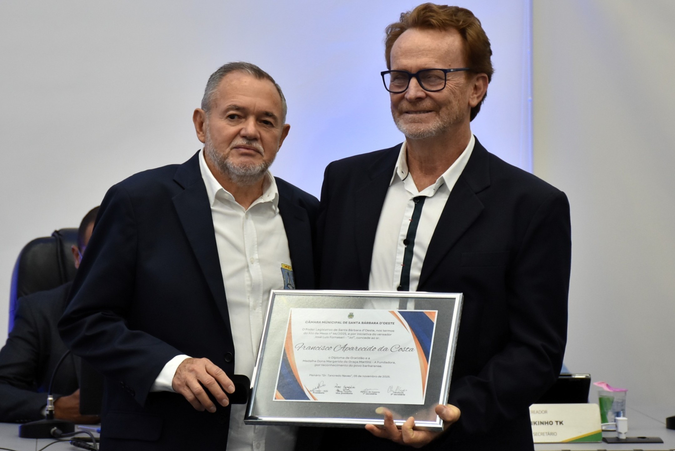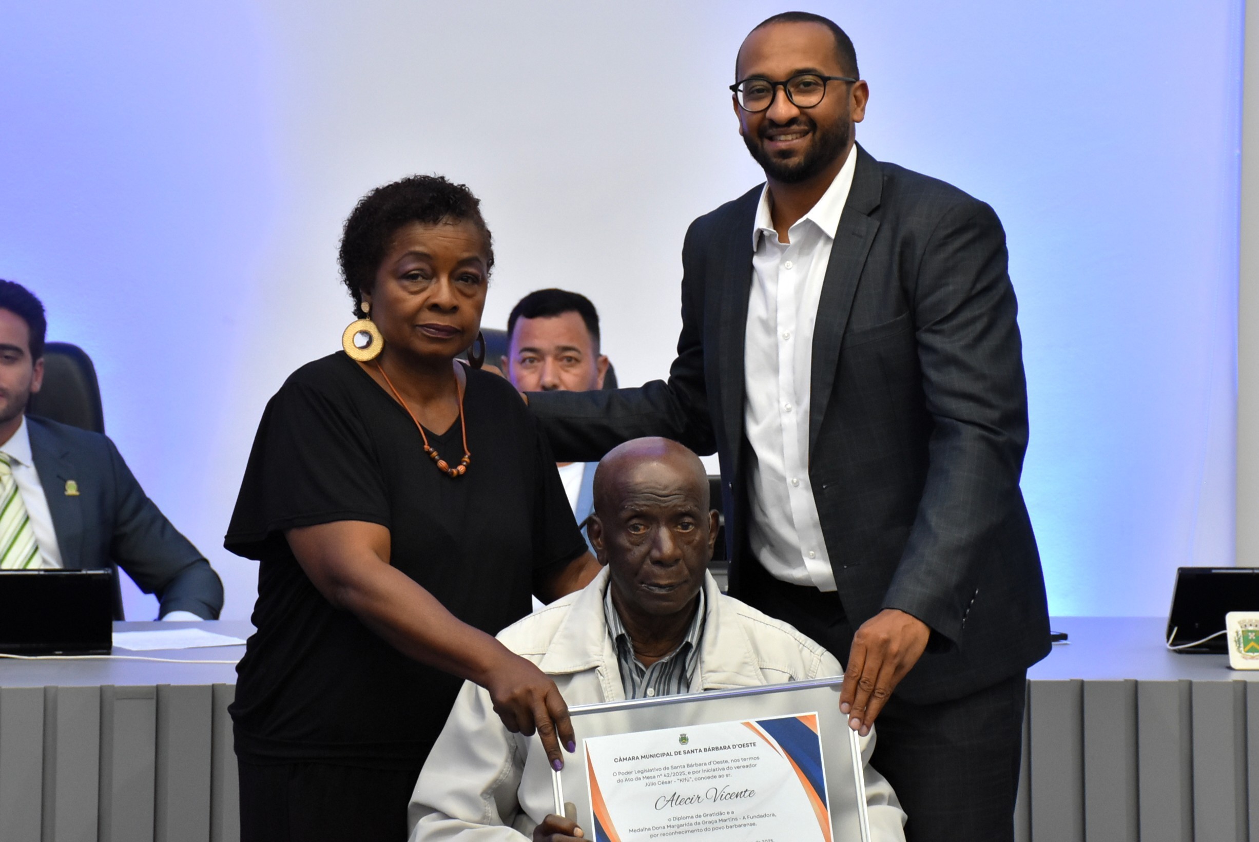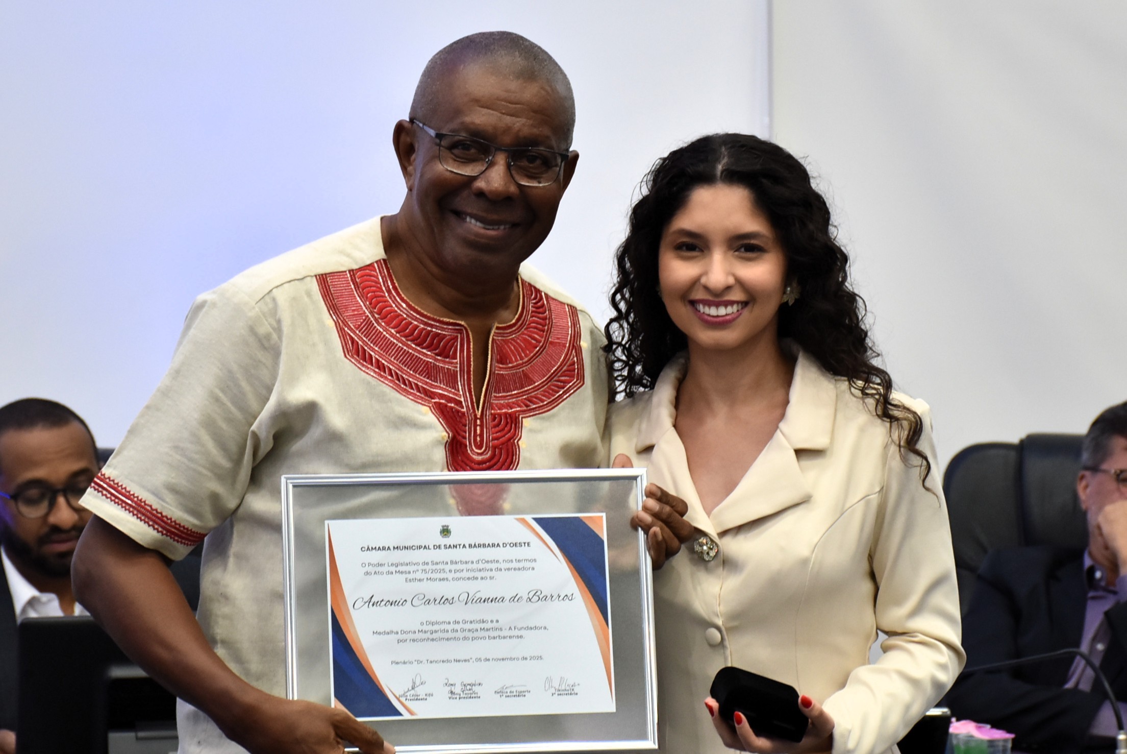 A cerimônia foi realizada no Plenário “Dr. Tancredo Neves”, sede do Legislativo barbarense, e, além dos parlamentares, contou com a presença do vice-prefeito Felipe Sanches, do ex-prefeito José Maria de Araújo, que também compôs a Mesa de Honra, além do ex-prefeito Denis Andia, entre os homenageados da noite.