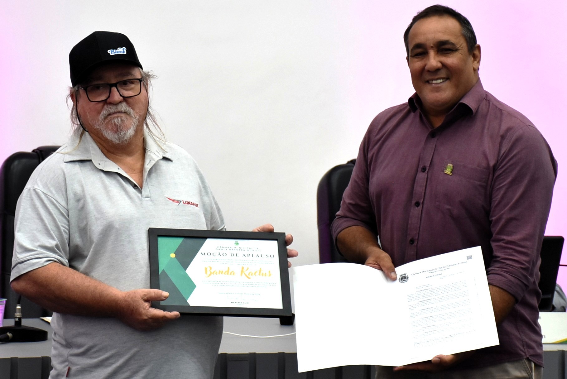 Por fim, foi aprovada a Moção nº 173/2026, do vereador Marcelo Cury, que manifesta aplausos à Banda Kactus. A homenagem foi entregue em plenário ao fundador da banda, José Roberto Delphino (Zé Mineiro).