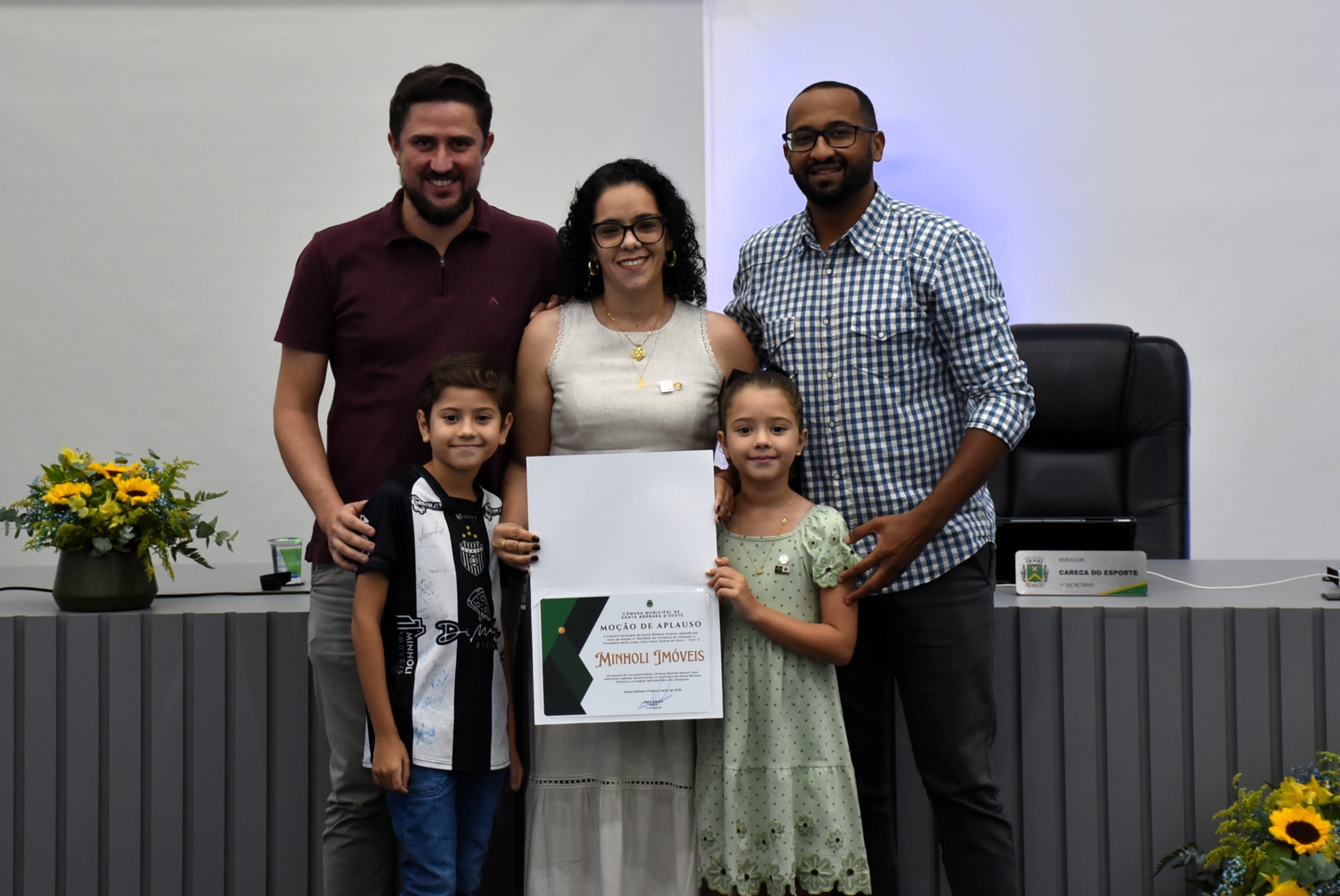Ainda na sessão, o presidente do Legislativo, vereador Júlio César Kifú, homenageou a Minholi Imóveis, pelo relevante trabalho desenvolvido em Santa Bárbara d’Oeste, por meio da entrega de cópia da Moção de Aplauso 182/2026.